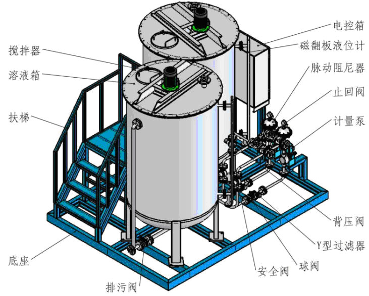全自動加藥設備是用于鍋爐水協(xié)調磷酸鹽處理(控制爐水R值)的自動加藥裝置。自動加藥裝置裝置由三個計量箱、三臺計量泵、一套交流變頻式R值自動控制系統(tǒng)、連接管路、閥門、底座等組成。