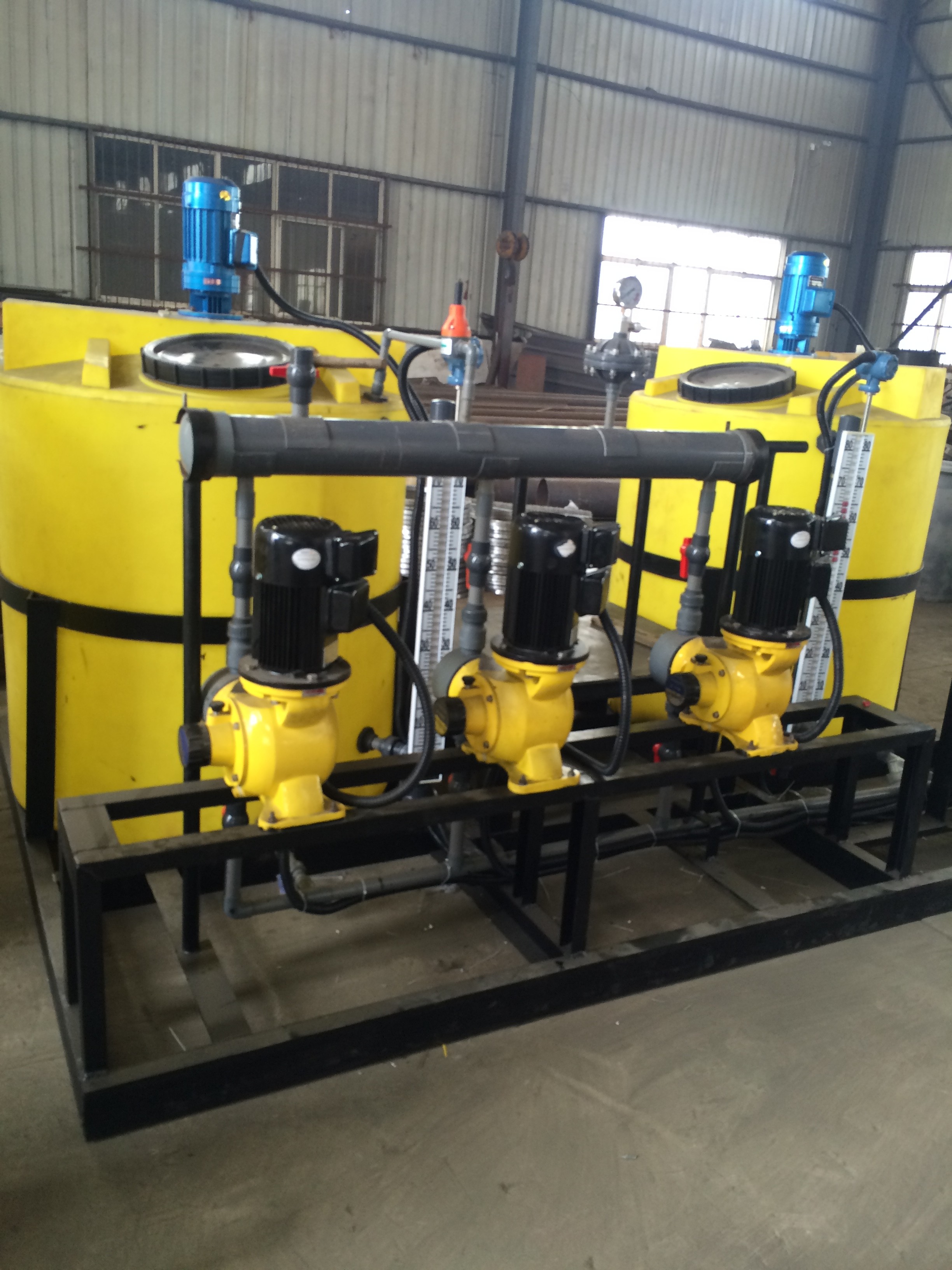 全自動一體化加藥裝置以計量泵為主要投加設(shè)備、將溶藥箱、攪拌器、液位計、安全閥、止回閥、壓力表、過濾器、緩沖器、管路、閥門、底座、扶梯、自動監(jiān)視系統(tǒng)、電力控制系統(tǒng)等按工藝流程需要組裝在一個公共平臺上,形成一個組合式單元。配有攪拌系統(tǒng)、加藥系統(tǒng)和自動控制系統(tǒng),幾個固定式可組合成一個整體。